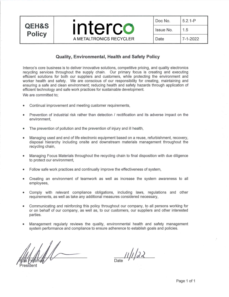 Interco’s core business is to deliver innovative solutions, competitive pricing, and quality metal recycling services throughout the supply chain. Our primary focus is creating and executing efficient solutions for both our suppliers and customers while protecting the environment and worker health and safety. We are conscious of our responsibility for creating, maintaining and ensuring a safe and clean environment; reducing health and safety hazards through application of efficient technology and safe work practices for sustainable development.